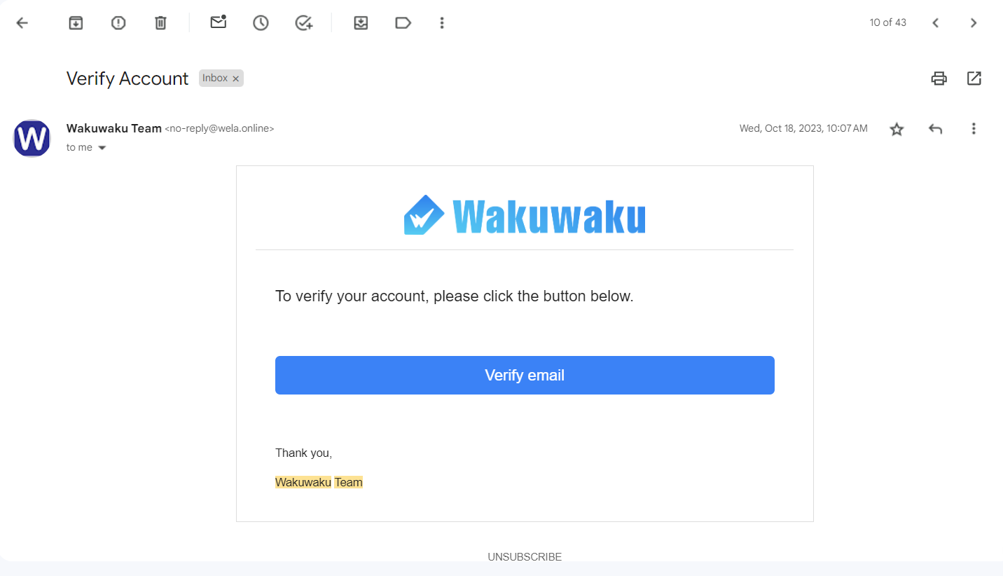 Step 11: Kindly check your email to see the verification email from Wakuwaku Team and verify the account you created.